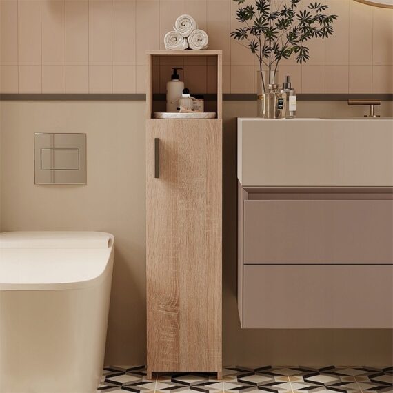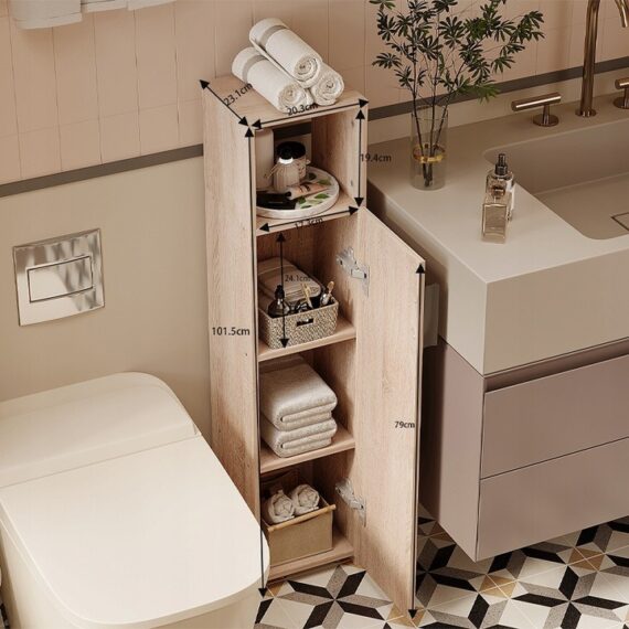 Nowoczesna I funkcjonalna szafka łazienkowa typu słupek w kolorze jasnego brązu to praktyczne rozwiązanie do małych I średnich łazienek. Smukła konstrukcja pozwala optymalnie wykorzystać przestrzeń, oferując wygodne miejsce do przechowywania.