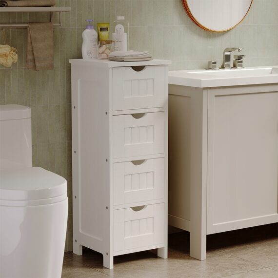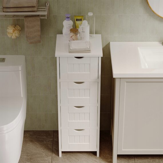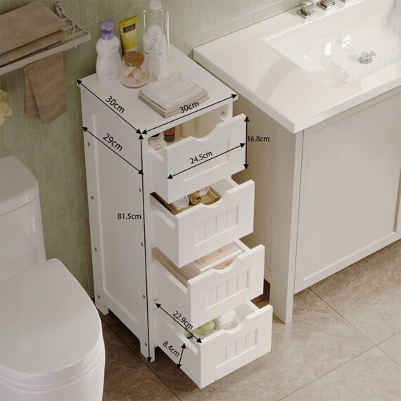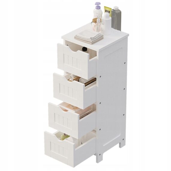 Dzięki czterem praktycznym szufladom z łatwością uporządkujesz kosmetyki, środki czystości czy akcesoria łazienkowe. Wąska konstrukcja pozwala maksymalnie wykorzystać przestrzeń nawet w niewielkiej łazience, zapewniając wygodny dostęp do wszystkich potrzebnych rzeczy.