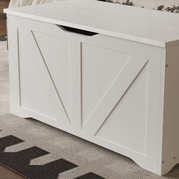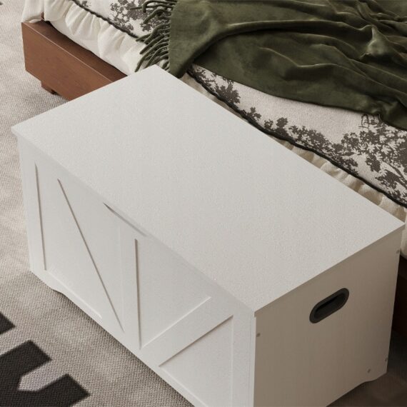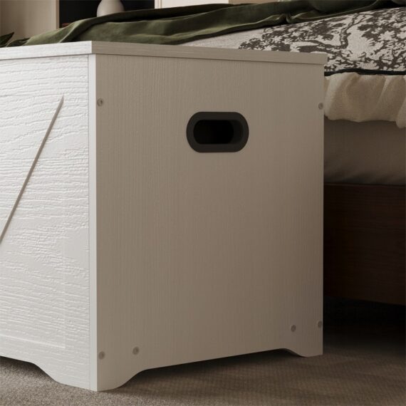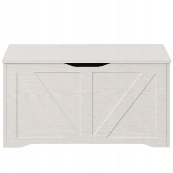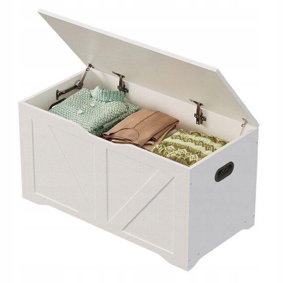 Pojemna I stylowa drewniana skrzynia w kolorze białym to praktyczne rozwiązanie do przechowywania pościeli, koców, poduszek oraz innych domowych tekstyliów. Dzięki minimalistycznej formie w stylu loft doskonale sprawdzi się w sypialni, salonie lub przedpokoju, łącząc funkcjonalność z estetyką.