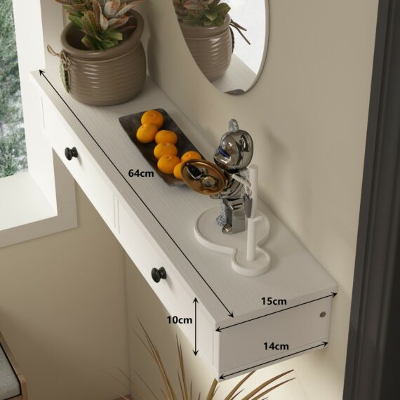 Dzięki montażowi na ścianie półka oszczędza miejsce i jest łatwa w czyszczeniu. Solidna konstrukcja z płyty MDF gwarantuje trwałość i bezpieczne podparcie.