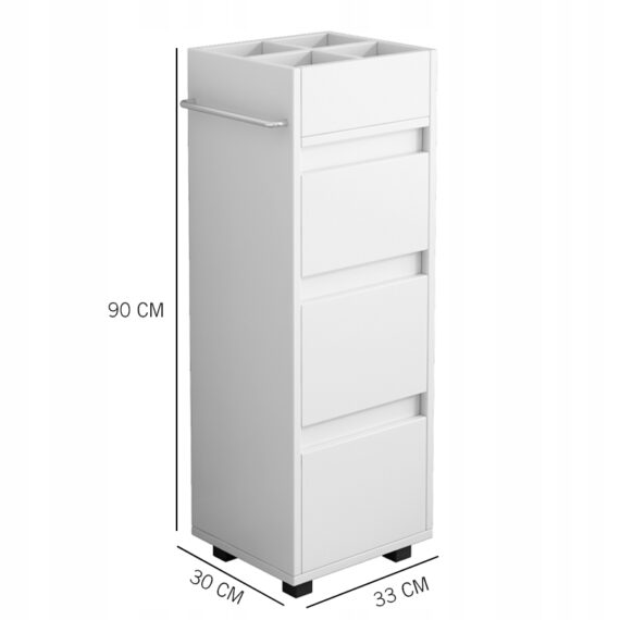 - Wymiary: 33 cm (szerokość) x 30 cm (głębokość) x 90 cm (wysokość) – idealne do małych i średnich łazienek