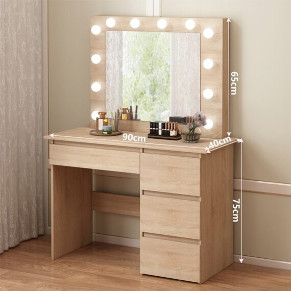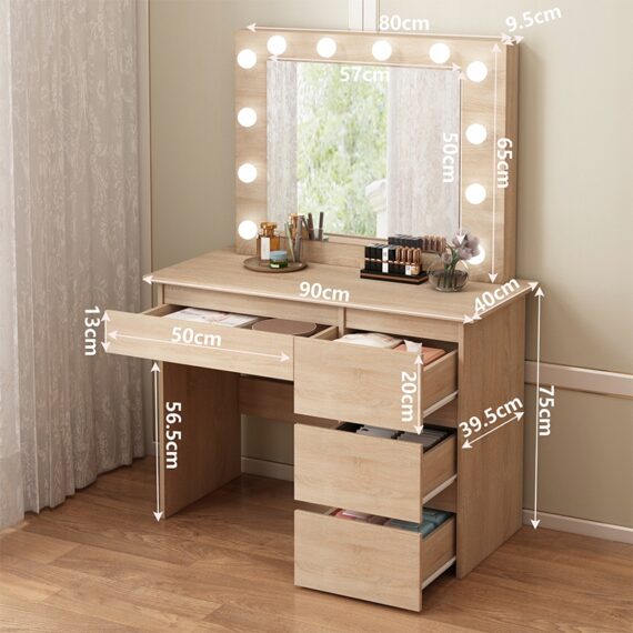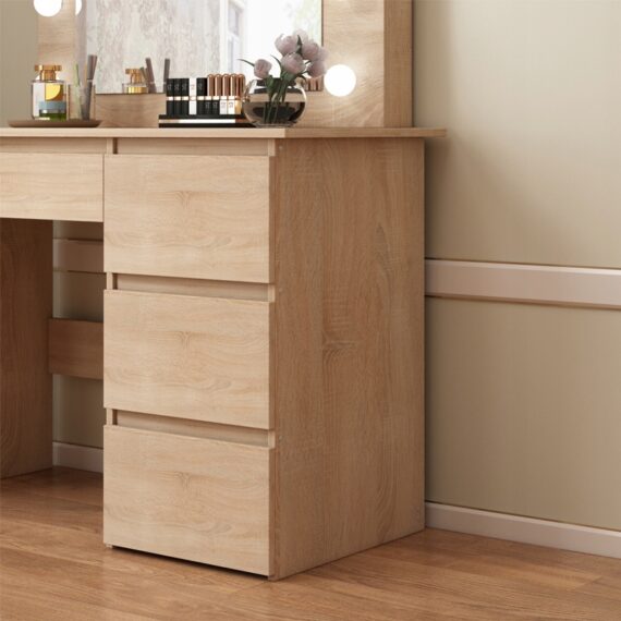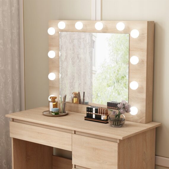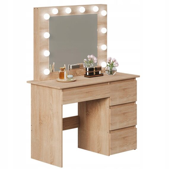 Dzięki czterem przestronnym szufladom bez problemu uporządkujesz kosmetyki, biżuterię I akcesoria. Duży blat roboczy daje wygodną przestrzeń do codziennego użytkowania, a oświetlenie led zapewnia perfekcyjne warunki do wykonania makijażu. Toaletka sprawdzi się nie tylko w sypialni, ale także w garderobie czy salonie.