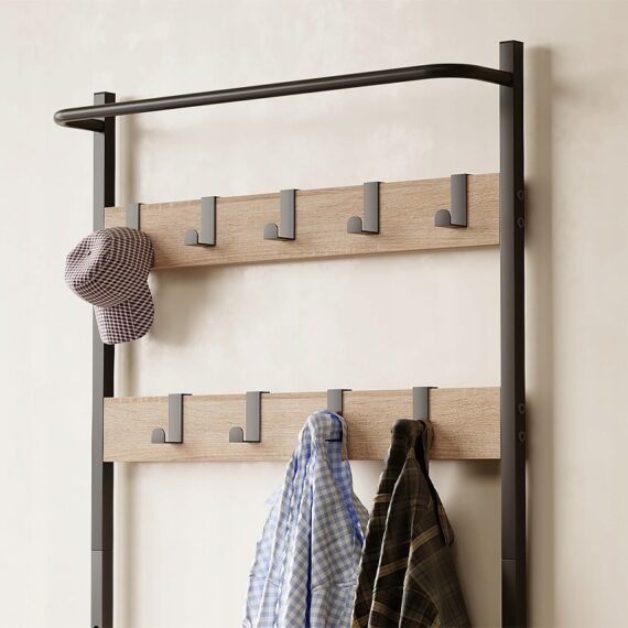 Idealny do przedpokoju, sypialni, garderoby czy biura – wieszak sprawdzi się wszędzie tam, gdzie potrzebna jest funkcjonalna przestrzeń do przechowywania ubrań I obuwia.
